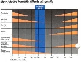 Since the air in your home is always trying to reach its saturation point, it will absorb water wherever it is found. That means it is stealing moisture from the bodies of you and your children, your pets, your furniture and even your house plants. By giving up moisture to the air, your skin, throat and nasal passages dry out and crack leading to various physical discomfort. That’s why many doctors recommend humidifiers for allergy and asthma sufferers. Research has shown that 30% – 60% relative humidity is ideal. Outside this range, bacteria, fungi, viruses and mites thrive and multiply. As these creatures increase in number, so does your risk of being adverely affected.